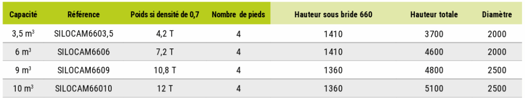 Ce modèle de silo est adapté pour les aliments à forte densité. Pour une densité plus basse (densité maximum 0,7), vous pouvez opter pour nos autres modèles : le silo à cône axial, le silo à goulotte déportée ou le silo déplaçable.